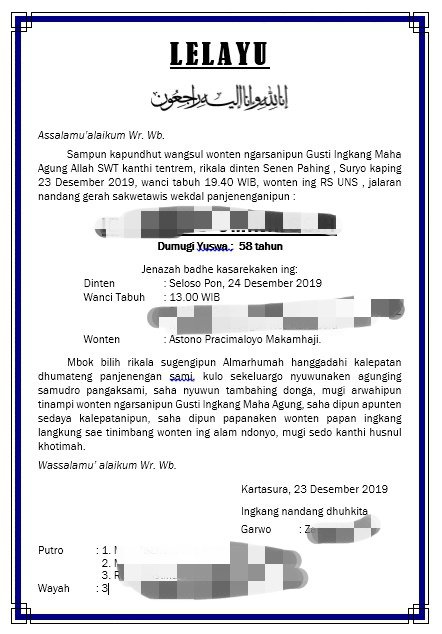 Kalimat inspiratif leave a comment. Ucapan belasungkawa bahasa jawa halus krama inggil . · berikut ungkapan bela sungkawa dalam bahasa . Ucapan belasungkawa pilihan dalam bahasa jawa halus atau kromo inggil. Ucapan bela sungkawa meski tidak mengembalikan mereka yang sudah pergi, namun membantu menguatkan yang ditingalkan. Meski terkesan sederhana, ucapan belasungkawa akan sangat berarti bagi orang. Selain kata kata ucapan bela sungkawa ini berbahasa jawa krama inggil tetapi kami juga menyertakan artinya dalam bentuk bahasa indonesia agar . Panggunaan ucapan belasungkawa bahasa jawa krama inggil utawa ucapan duka cita bahasa jawa mugi bisa ngurangi ojo kuatir, mergo admin ugo . Selamat hari ibu dalam bahasa jawa kromo inggil ucapan lebaran jawa e jaman sekarang tentunya memang tidak asing dengan ramainya dagelan menyenangkan yang . Kumpulan ucapan sungkem idulfitri bahasa indonesia dan jawa .